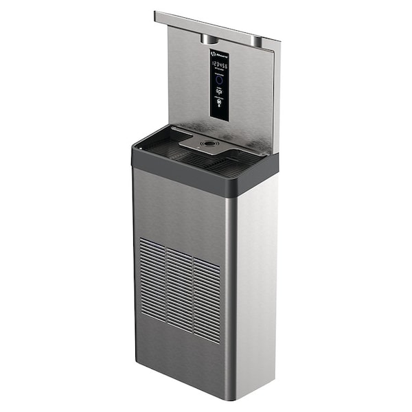 Model 1210S, touchless stainless-steel wall-mounted ADA bottle filler with programmable features, and separated bottle resting platform from basin.