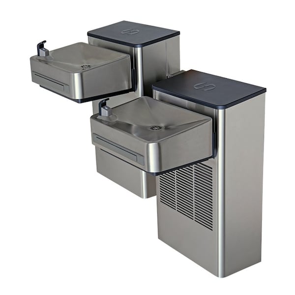Model 1202SF, filtered, stainless steel Hi-Lo wall mount ADA water cooler with an electronic valve and push bar assembly.