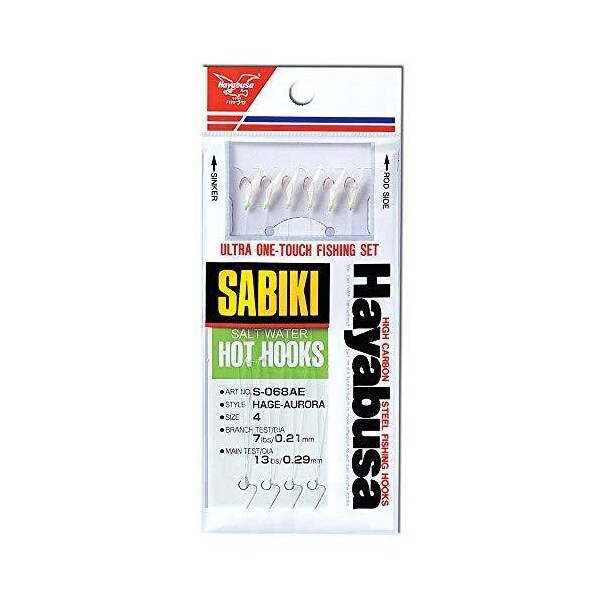 How to Catch fish with SABIKITo catch fish such as mackerel, herring, smelt and Spanish mackerel, use a 6 to 9hoot light action rod with a spinning reel Tie the SABIKI rig to the line and attach a chum cage to the endThe best chum is frozen krill, but when it is unavailable, try minced squid or possibly pet food Remember to use plenty of chum at all times Quickly drop the rig into the water to the depth of the school of fish Slowly lift up the rod tip, allowing the chum to scatter downward then rapidly lower the rig into the now dispersed chum and into the mouths of the frenzied fish below Repeat this motion several times If you still do not get hit, reel in your line, refill the chum cage and try again Once you have a fish on, remember to wind up the line slowly in order to prevent tearing the hook from the fish's mouth, as well as to retrieve more fish This slow reeling in of the line is the key to successful SABIKI fishingHayabusa also offers SABIKI lures for larger game fish, such as yellowtail, halibut, barracuda, bonito, sea bass, grouper and rockfish To catch yellowtail, barracuda, bonito and sea bass, attach our modified chum cage filled with whole shrimps or small squid on top of the SABIKI rig Let the rig drift in the current until you experience a hook up For bottom fish rigs, specifically dressed hooks can be enhanced with various cut baitWhatever type of fish you chose, Hayabusa offers the most complete selection of SABIKI lures Hayabusa S068AE6