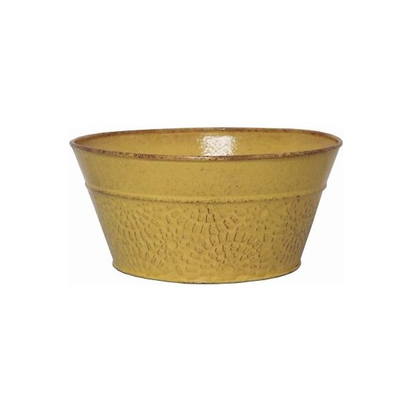8 Cove Sheet Metal Bowl Planter Sunflower Yellow Color. The embossed design features a triple-coated textured finish that looks like glazed ceramic. Includes pre-drilled drainage holes.