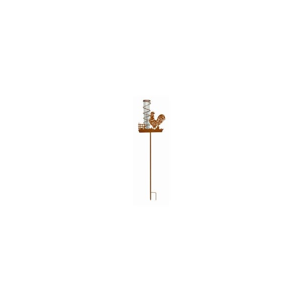 Metal Stake Rooster Rain Gauge. It is made of metal and has a stake for easy installation. It is a decorative way to measure rainfall.