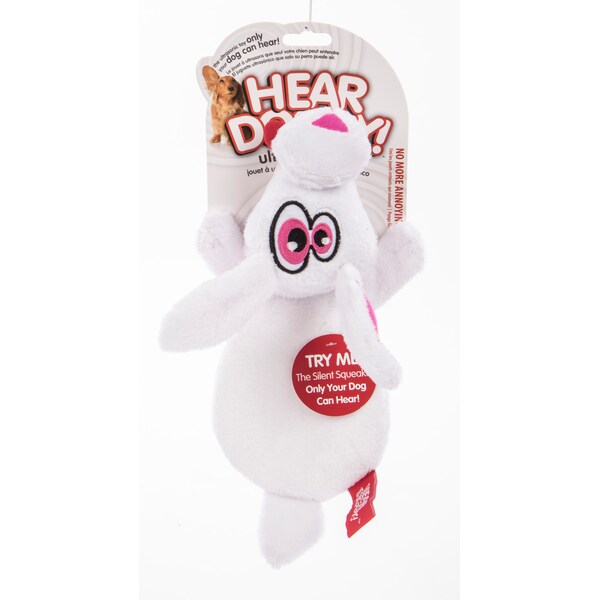 The best toy to have while working alongside your dog, either at home or in the office.Our HEAR DOGGY! Flatties are the perfect noiseless dog toys. All the fun of a traditional squeaker HEAR DOGGY! squeakers are tuned an ultrasonic frequency between 24 and 28 KHz that is silent to people but not dogs. This colorful, soft and silly, under stuffed dog toy is perfectly sized to carry, cuddle and squeak. HEAR DOGGY! gives pet parents the best of all worlds: innovative products, stylish designs, environmental responsibility, and exceptional value with a variety of plush silent squeaker toys to meet a dog's needs for play, fun and a pet Parent's need for quiet! HEAR DOGGY! products are designed to meet child safety standards and are backed by our 100% satisfaction guarantee. If a customer is dissatisfied with a HEAR DOGGY! product for any reason, we will replace or refund it. Read all packaging instructions, warnings and cautions upon receipt. Packaging contains small parts, discard after opening.