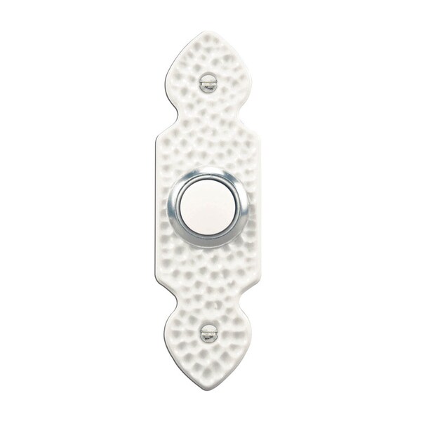 This wired push button features a hammered white finish with lighted center. This push button has a portion that must recess into the surface it is mounted to. It requires a 5/8 inch (or 16 mm) diameter hole to be mounted properly. The plate of this push button sits flush on the surface while the back portion of the push button recesses into the hole.