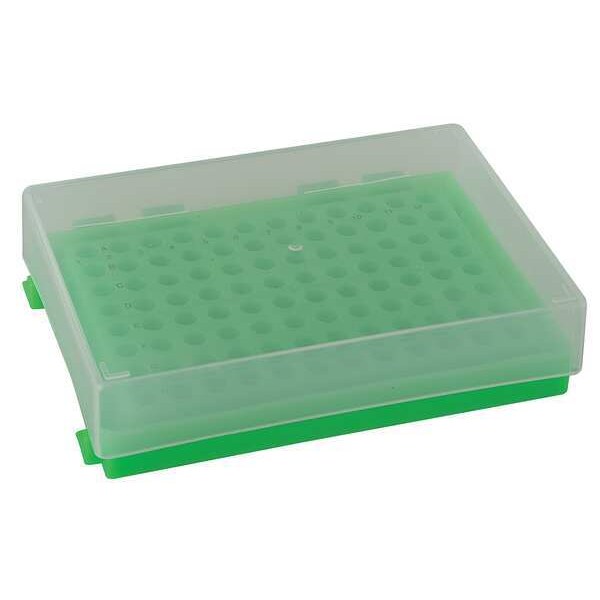Item Tube Rack, Number of Compartments 96, Autoclavable Yes, Material Polypropylene, Green, Height 1 1/4 in, Length 5 in, Width 3 1/2 in, For Use With Microcentrifuge Tubes, Includes Hinged Lid, Package Quantity 5