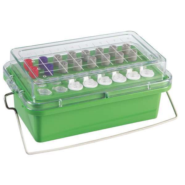 Cooler, Capacity 2 mL, Color Green, Overall Height 3 7/8 in, Overall Length 9 5/8 in, Overall Width 4 1/8 in, Polycarbonate