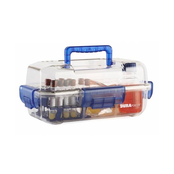 DuraPorter provides a secure and clean environment for carrying biological and clinical samples from one location to another. Ideal for use with a variety of laboratory items such as tubes, bottles, vials and instruments. DuraPorter transport boxes are constructed from high clarity polycarbonate that allows easy visibility of contents.Transport boxes feature a positive latching hinged lid, leak tight silicone gasket, three integral clasps and a folding handle. Lid opens 180° for easy access to the interior compartment. Supplied with dividers to customize interior space.Transport boxes can be autoclaved at 121°C for a maximum of 15 minutes.Note: Handles should remain open during autoclaving process.