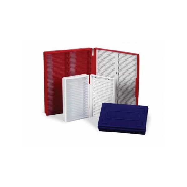 Microscope slide boxes store 100 slides (3'' x 1'' or 75 mm x 25 mm slides). Manufactured from durable polypropylene with hinged lids and latch lock. Numbered slots correspond to the slide inventory sheet on the inside cover with PROJECT and DATE. Boxes provide convenient stacking and efficient storage. Molded feet enable secure stacking for easy transport and storage.Durable polypropylene Slide identification card