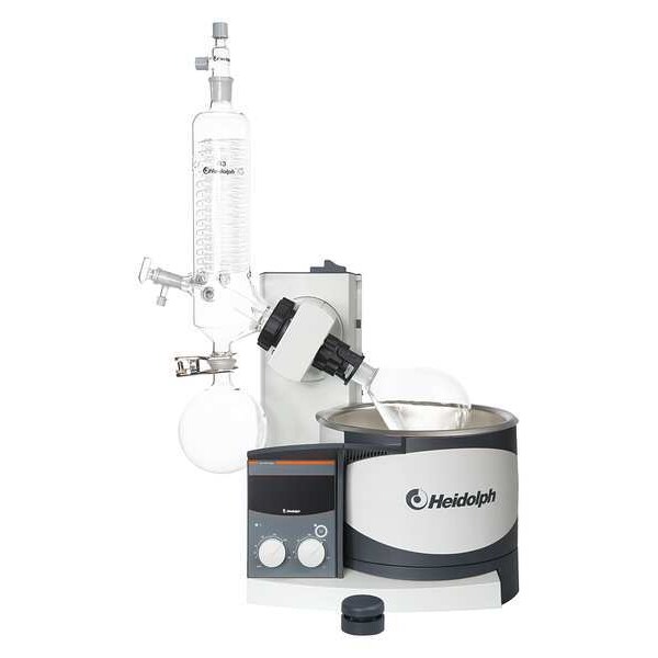 Rotary Evaporator, Height Adjustment Method Manual, Heating Capacity 1300W, Glassware Set Type G5B, Coated Dry Ice Condenser, Temp. Setting Method Scale, Vapor Temp. Sensor No, Vacuum Controller No, Temp. Range 20 Degrees to 210 Degrees C, RPM Range 10 to 280, Drive Type Brushless DC Motor with Electronic Speed Control, Watts 1400, Height 34-59/64 In., Width 19-19/64 In., Depth 29-3/32 In.