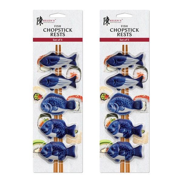 Helen's Asian Kitchen Fish Chopstick Rests elevate chopstick tips between bites to keep tables clean Made from ceramic with a scratch-free glaze; lead and cadmium free; 2 sets of 5; each measures 2.17 x 0.55 x 0.55-inches Keeps chopsticks from touching the table or rolling away; useful for everyday meals and entertaining Ideal for resting chopsticks, spoons, knives, and more; great additions to dinnerware and flatware Hand painted by skilled artisans; reusable, durable, versatile, and dishwasher safe for easy cleanup