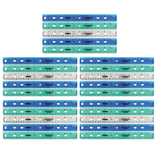 Classic 12 / 30cm Ringbinder ruler, now made safer with shatter-resistant material! Unlike standard rulers that create dangerous shards of plastic when bent or broken, our shatter-resistant material is much safer if the ruler is broken, making it ideal for young students. And the translucent body means you can easily see what you are measuring for better accuracy with both Metric and'' graduations printed clearly on the ruler. Integrated ringbinder holes and a large hang hole make this ruler easy to transport and store! Sold as a pack of 25 in assorted colors: Teal, Blue and Gray no color choice.