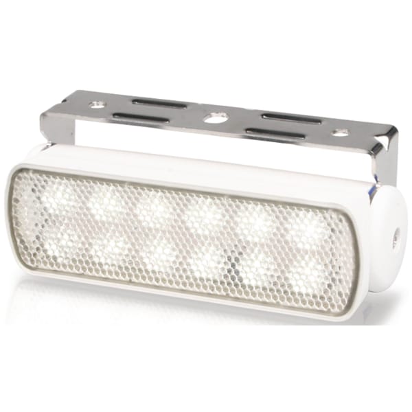 Compact, lightweight LED lamps are completely sealed and can be installed almost anywhere onboard, interior or exterior. Less than 3W power consumption, but 240 lumens of intense white light. Heavy duty Polyamide 'optical nylon' lens and high impact nylon housing. 2.5m of marine tinned cable is sealed and pre-wired into each lamp for absolute water tightness. Integrated Multivolt electronics provide protection from reverse polarity, voltage spikes and low battery voltages and ensure full 750 lumens brightness. The low profile 316 stainless mounting bracket secures the lamp body from both sides and allows easy adjustment of the vertical light beam angle.Spread lamps are suited for illuminating cockpits and transom areas with a close range, wide spread of light