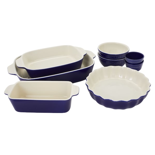 This 8-piece set contains all the bakers and servers you need for casseroles, breads, crumbles, and pies. Prepare batters in the roomy universal bowls, portion out ingredients in the handy ramekins, and bake lasagna in the large rectangular baking dish, apple pie in the elegantly scalloped pie dish, and bread in the loaf pan.These handmade stoneware dishes are highly resistant to thermal shock, gently retain heat, and are incredibly moisture resistant, offering remarkable durability. Thanks to their beautiful highly scratch-resistant vitreous glaze, you can take them straight to the table for a beautiful presentation. And when the meal is over, they stack safely and snugly for compact storage. Oven safe to 572°F, these versatile dishes are also microwave, dishwasher, and freezer safe.HENCKELS is committed to sustainability. The unique firing process used to make HENCKELS ceramics results in an eco-friendly, energy saving production. Set includes 13 x 10-inch rectangular dish, 10 x 7.5-inch rectangular dish, 8.3 x 4-inch loaf pan, 2 x 22-ounce universal bowls, 2 x 7-ounce ramekins, 9.5-inch pie dish. Beautiful vitreous glaze finish is highly scratch resistant. Stoneware will not absorb moisture, diffuses heat gently and retains heat exceptionally well. Transitions from oven to table beautifully. Bakers, bowls, and ramekins each snugly and safely stack for compact storage. Microwave, freezer, dishwasher, and oven safe up to 572°F. Sustainably made using a unique energy-saving firing process.