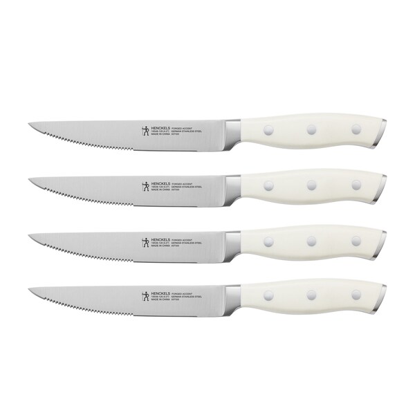 The Forged Accent steak knife set includes 4 knives with semi-serrated edges, so that you can slice through meat and poultry with razor sharp precision. These knives feature a handsome white handle and are stored in an attractive black gift box.Forged Accent knives are fabricated from high-quality German stainless steel, perfect for precision cutting. The forged bolster construction seamlessly transitions from blade to handle for durability and balance. Curved for comfort, the triple-rivet handle features a stylish, stainless-steel endcap that adds aesthetic appeal to your knife block. Stamped with the single man HENCKELS logo, this Halberdier symbolizes Forged Accent's superb quality at a remarkable value. Set includes four 4.5-inch knives. Stored in an attractive black gift box. Knives fabricated from high-quality German stainless steel. Professional, satin-finished blade is honed for long-lasting sharpness. Semi-serrated edge blade for precision cutting. Forged bolster construction offers durability and balance and a seamless transition from blade to handle. Ergonomic, triple-riveted handle available in three colors: red, white, and black. Dishwasher safe, hand washing recommended.