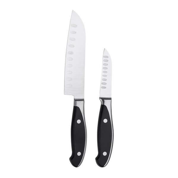 The Henckels International Forged Synergy 2-pc Asian Knife Set is perfect for performing detailed kitchen tasks with ease. Fabricated from high-quality German stainless steel, the fine-edge blades produces precision cuts. This set features a 3'' Hollow Edge Kudamono Paring Knife and a 5'' Hollow Edge Santoku Knife. Both blades have small indentations, aka grantons, which prevent food from sticking while cutting.The forged bolster construction seamlessly transitions from blade to handle for durability and balance. Designed for comfort and style, the ergonomic double-rivet handle features a sleek, stainless steel backing that looks as good as it feels.Henckels International makes essential kitchen tools every home chef needs. From steak knives to spatulas, every product boasts high quality at an exceptional value. Created in 1895 by Zwilling J.A. Henckels, this value-driven brand guarantees the same durability, design and ease of use for which the global company is known. Equip your kitchen with expertise with Henckels International. Set includes 3'' Kudamono Paring Knife Hollow Edge and 5'' Santoku Knife Hollow Edge. Fabricated from high-quality German stainless steel. Forged bolster construction offers durability and a seamless transition from blade to handle. Professional, satin-finished blade boasts precision cutting and is finely honed for long-lasting sharpness. Modern, double-rivet handle with a stainless steel backing gives comfort in style. Dishwasher safe. Made in China.