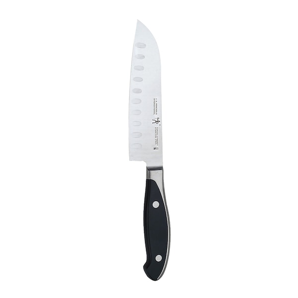 The Henckels International Forged Synergy 5'' Hollow Edge Santoku Knife allows you to cut with confidence. Fabricated from high-quality German stainless steel, the Santoku - Japanese for ''three virtues'' - excels at three cutting techniques. Expertly mince garlic, slice cucumber, and dice onions with this Asian all-rounder, whose hollow edge blade has small indentations, aka grantons, which prevent food from sticking while cutting.The forged bolster construction seamlessly transitions from blade to handle for durability and balance. Designed for comfort and style, the ergonomic double-rivet handle features a sleek, stainless steel backing that looks as good as it feels.Henckels International makes essential kitchen tools every home chef needs. From steak knives to spatulas, every product boasts high quality at an exceptional value. Created in 1895 by Zwilling J.A. Henckels, this value-driven brand guarantees the same durability, design and ease of use for which the global company is known. Equip your kitchen with expertise with Henckels International. Fabricated from high-quality German stainless steel. Forged bolster construction offers durability and a seamless transition from blade to handle. Professional, satin-finished blade boasts precision cutting and is finely honed for long-lasting sharpness. Modern, double-rivet handle with a stainless steel backing gives comfort in style. Dishwasher safe. Made in China.