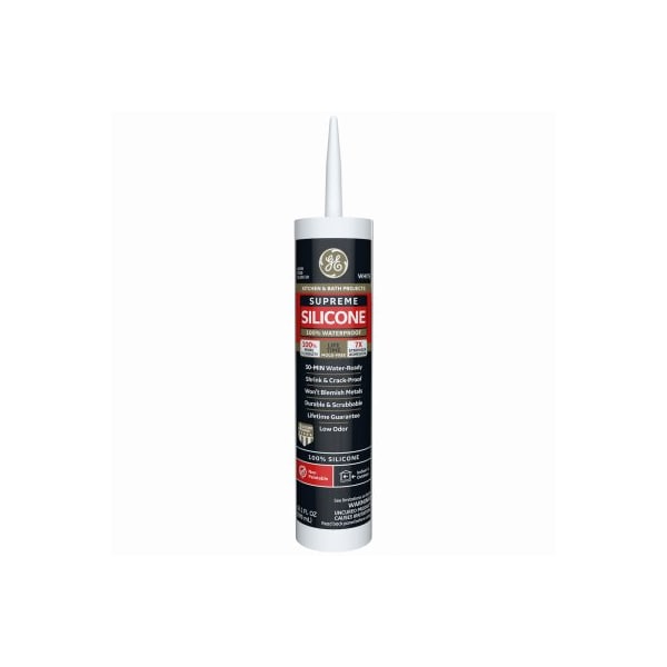 GE supreme silicone kitchen and bath sealant caulk, 101 oz, white, silicone caulk Supreme silicone kitchen and bath sealantisapremium, 100siliconeand100 waterproofsealant ideal for areas constantly exposed to moisture This 30minute waterready formula has 100 more flexibility than class 25 sealants and has 7x stronger adhesion than silicone 1 sealant It offers 50 joint movement capability for a shrink and crackproof seal This sealant also resists mold and mildew growth with lifetime moldfree product protection