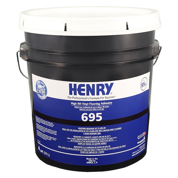 HENRY 695 is a premium, high-strength adhesive for the permanent installation of vinyl-backed flooring. HENRY 695 generates high, ultimate bond strength as both a wet-set and a pressure-sensitive adhesive, plus it delivers excellent initial grab and early bond strength for pressure-sensitive installations. Moisture resistant up to 99%. Ideal for Luxury vinyl tile (LVT), plank, vinyl backed sheet flooring. a generous 4 hour working time make this an easy product to work with. Solvent free, low odor and low emissions make this achieve a Greenline product without sacrificing any quality. Antimicrobial product protection. Sold as a 4 gallon.