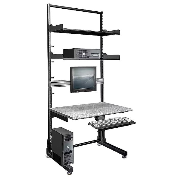 Computer Workstation, Product Type Computer Workstation, Overall Height 87 in, Overall Depth 35 in, Number of Trays 1, Overall Width 36 in, Weight Capacity 1,500 lb, Number of Shelves 2, Shelf Width 36 in, Color Black, Gray, Material Laminate, Metal, Number of Display Mounts 1, Desktop Depth 30 in, Finish Powder Coated, Locking Drawers Not Applicable