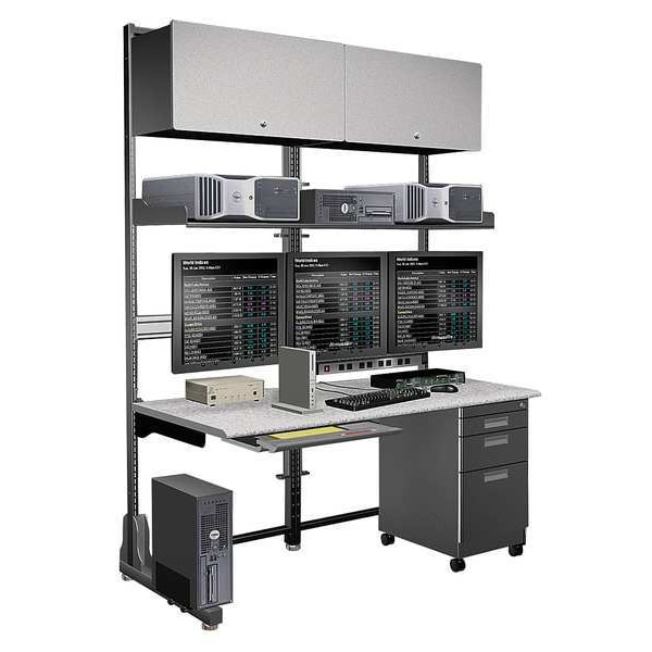 Computer Workstation, Product Type Computer Workstation, Overall Height 87 in, Overall Depth 35 in, Number of Trays 1, Overall Width 60 in, Number of Cabinets 2, Weight Capacity 1,500 lb, Number of Shelves 1, Shelf Width 60 in, Color Black, Gray, Material Laminate, Metal, Number of Casters 4, Number of Display Mounts 3, Number of Drawers 3, Finish Powder Coated, Locking Drawers Yes