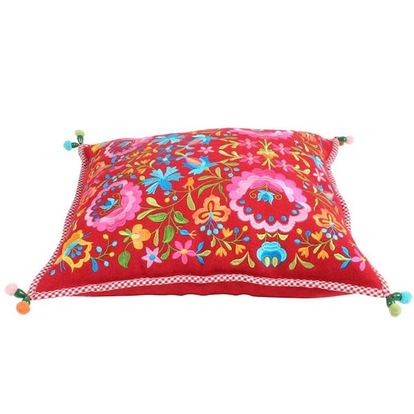 Features -With a riot of vivid color this embroidered folk design is sure to add cheer to any room -Red gingham piping pom-pom trim and hidden zipper closure Care Instruction -Crafted of wool excluding decoration -Spot clean only -100% polyester Specifications - Color: Red - Material: Wool - Pillow Cover Size: 18 x 18