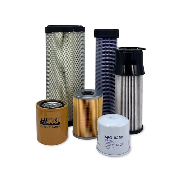 Primary Air Filter, Secondary Air Filter, Engine Oil Filter, Primary Fuel Filter Water Separator, Secondary Fuel Filter, Transmission/Hydraulic Filter