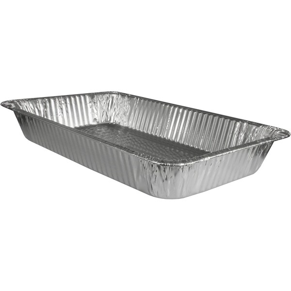 This full size steam table pan measures 3 3/16 inches deep and is designed for commercial food service use. It is constructed from durable materials suitable for holding and serving hot or cold foods. The pan’s dimensions correspond to standard full size steam table specifications, making it compatible with most steam table units. Its depth allows for ample food capacity while maintaining efficient heat distribution. The pan is ideal for buffet lines, catering, and food preparation environments where consistent temperature control is required. Available in a pack of 50, its sturdy build supports frequent use and easy cleaning.