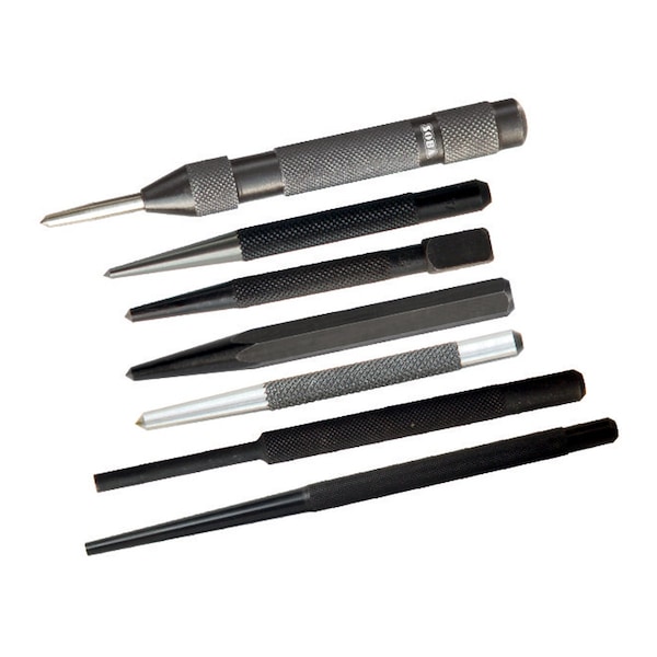 HHIP 7 Piece Combination Drive Pin Punch Set Tool steel heat treated. Knurled body. Complete with vinyl pouch. This set includes a 3/16 in solid/parallel pin punch, a 5mm taper/starter drift punch, a 1/7 in square center punch, a 3/16 in round center punch, a 5/32 in hexagonal center punchthat is 4 in long, a 5 in auto center punch, and a 2.5mm prick punch.