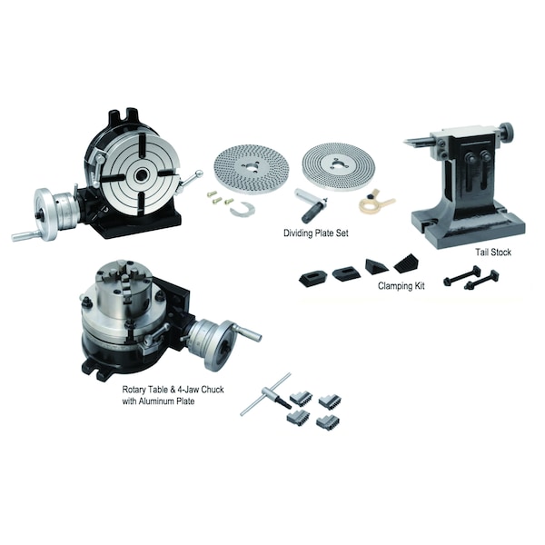 8 in. Rotary Table Tailstock Dividing Plates Lathe Chuck & Clamping Kit The included rotary table can be used in a horizontal or vertical position and with the included lathe chuck. This rotary table is precision ground with a low profile design. It's worm gear is easily disengaged for free rotation and the one piece worm and shaft are hobbed from solid alloy steel. The rotary table parts are strategically positioned for easy access and it has a 10 second vernier reading. One rotation of the rotary table handle equals 4 Deg on collar and it is graduated 360 degrees. Please see the pictures for more rotary table specs. Also included is a set of dividing plates suitable for the rotary table. This set includes index plates, a crank handle, 3 screws, a sector & a U washer. Index plates a and b are as follows: Plate A - 26, 30, 34, 38, 41, 44, 47, 51, 57, 28, 32, 37, 39, 43, 46, 49, 53, 59 & Plate B - 62, 67, 71, 77, 81, 87, 91, 97, 63, 69, 73, 83, 89, 93, 99. The adjustable tailstock height is 4.5 to 5.7 in.. The 5 in. 4-Jaw self-centering lathe chuck is a universal scroll chuck made of high grade tool steel. A chuck wrench and 2 sets of solid jaws, both ID and OD, are included. The 10 piece clamping kit parts are made of drop forged steel and the parts are case hardened and heat treated. The clamping kit includes 2 each of Step Clamps, Step Blocks, Studs, T-slot Nuts & Flanged Nuts.