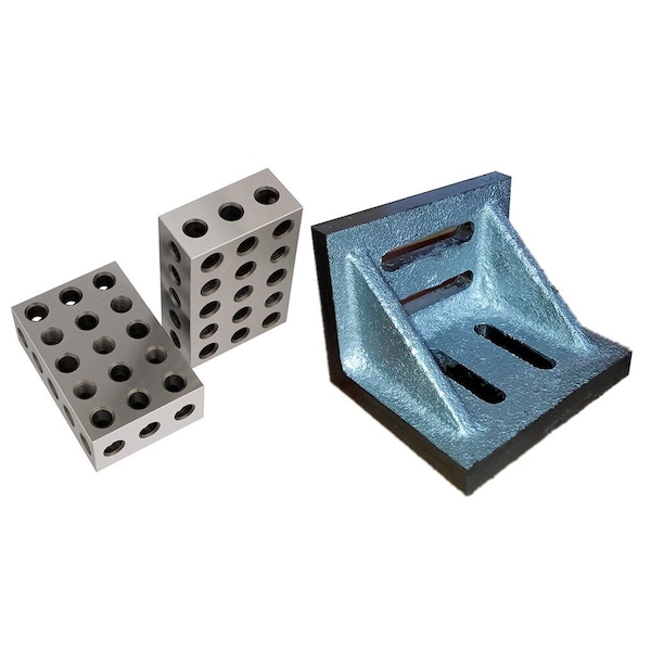 HHIP 3 X 25 X 2 Webbed Slotted Angle Plate 123 Block Set Matched Pair The angle plate is made of high tensile cast iron properly seasoned against distortion The angle plate clamping slots are widely used for machining, layout and inspection This angle plate is accurately machined and ground square and parallel on outside and ends The 123 block set is heat treated and case hardened to HRC 55 to 60 and is hardened and precision ground on all 6 sides of each block These 123 blocks have an accuracy with squareness on all sides within 0002 per inch There are 23 holes on each block that consists of 5 tapped holes that are 3816 for clamping and 18 untapped holes The 123 blocks have a cross drilling design which gives them minimum weight and maximum strength