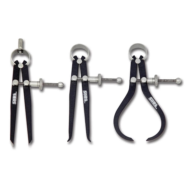 Pro-Series 4 in 3 Piece Spring Caliper & Divider Set Easy adjustment over entire range. Balanced legs, uniform tension. Carbon steel legs with ground tips hardened to HRC 35. Chrome plated fittings and black finished legs.