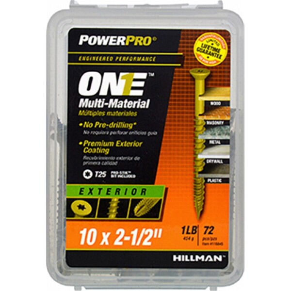 Features -Premium Bronze Epoxy Coating is recommended for exterior projects and treated lumber -Hex Washer Head design with star drive is ideal for high drive torque large bearing surface electrical wood metal and concrete/masonry applications -Patented design with spiral flutes serrated hi-lo thread and 3-sided pyramid point no pre-drilling is required in wood drywall plastic and metal up to 20 gauge -Bit included in pack provides stable driving no wobbling -Pack of 78 Specifications - Finish: Bronze Epoxy Premium Coated - Size: 10 x 2.5in - Country of Origin: Taiwan - Weight: 6.05 lbs