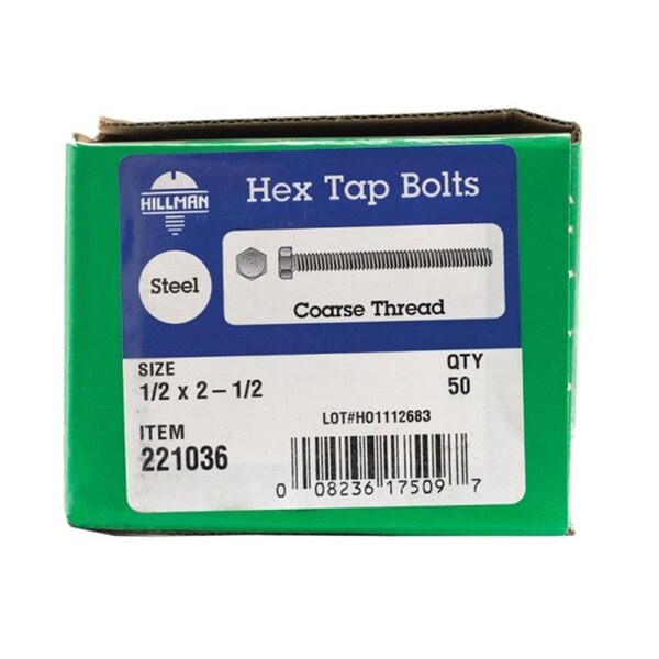 Features -0.5 x 1.5 in. Hex Tap Bolt -Box of 50 Specifications - Dimension: 3in H x 5.2in W x 4.2in L - Weight: 7.7 lbs