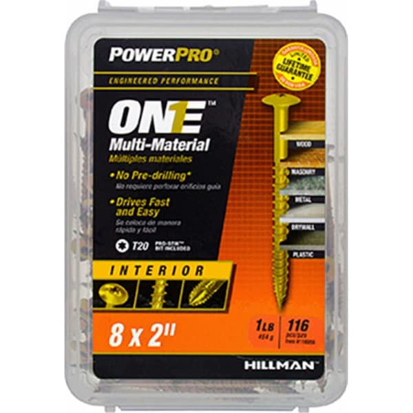Features -Great for interior applications in multi-materials not recommended for exterior projects or treated lumber -Wafer Head design with star drive is ideal for cabinet installation and low profile applications -Patented design with spiral flutes serrated hi-lo thread and 3-sided pyramid point no pre-drilling is required in wood drywall plastic and metal up to 20 gauge -Bit included in pack provides stable driving no wobbling -Pack of 116 Specifications - Finish: Yellow Zinc - Size: 8 x 2in - Country of Origin: Taiwan - Weight: 5.99 lbs