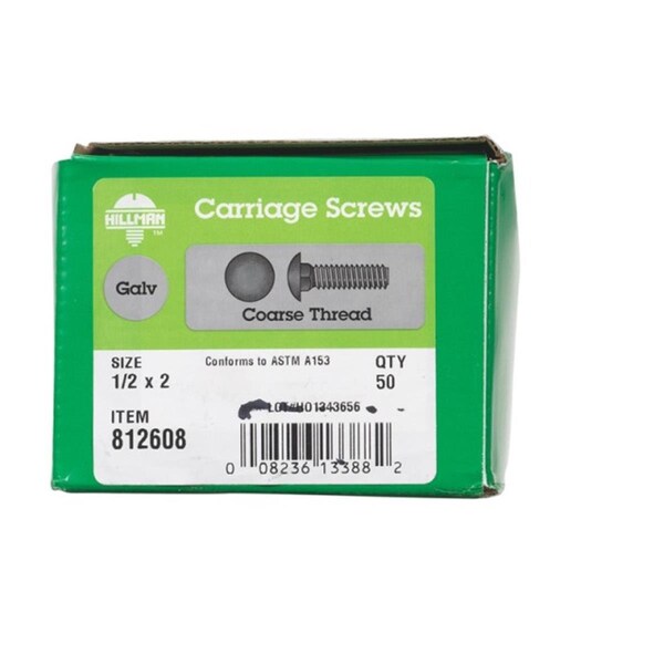 812608 0.5 x 2 in. Hot Dip Galvanized Carriage Bolts