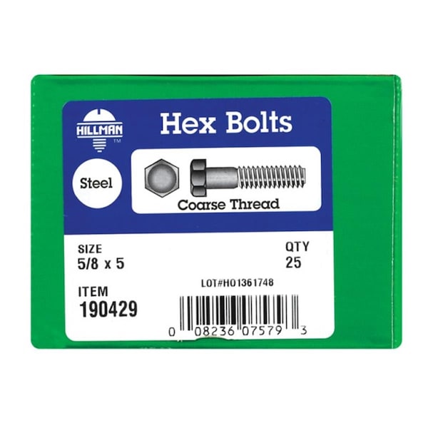 Hex Head Cap Screw, Zinc Plated Steel, 5 in L