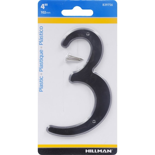 Simple and classic, this Hillman nail-on plastic house number 3 black (4") is perfect for use on a mailbox or your home. The sturdy construction stands up to weather. These house numbers are a great way to help make your address more visible to visitors and emergency workers alike.
