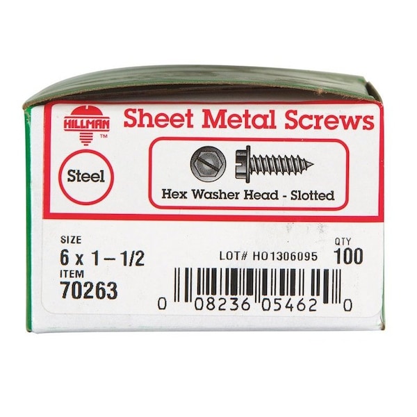 Sheet Metal Screw, Flange Hex Head Slotted Drive, 100 PK