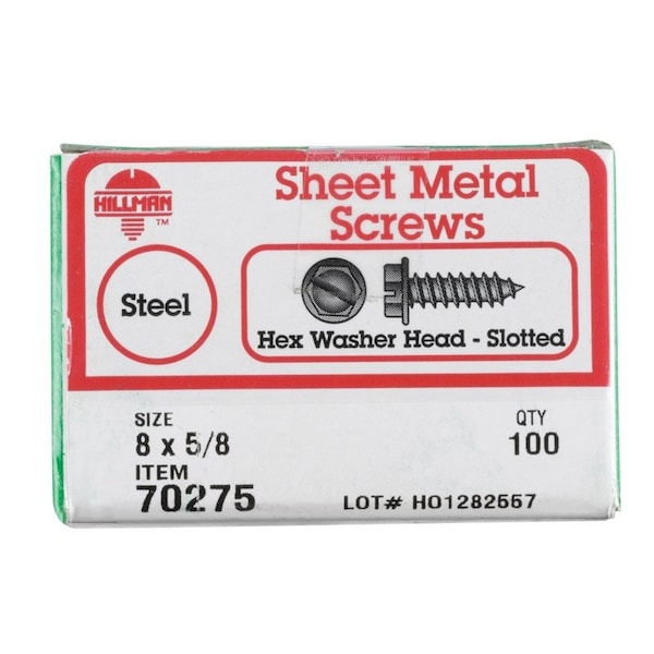 Sheet Metal Screw, Flange Hex Head Slotted Drive, 100 PK
