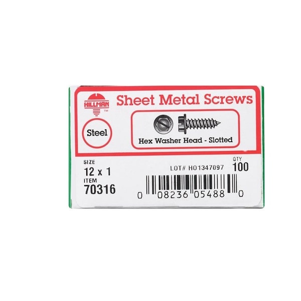Sheet Metal Screw, Flange Hex Head Slotted Drive, 100 PK