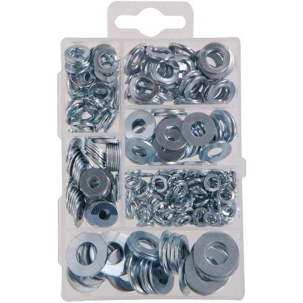 277-piece kit includes: 31 each 1/4 split lock washer (steel ZP) 59 each No. 10 flat washer (steel ZP) 15 each 5/16 split lock washer (steel ZP) 12 each 3/8 split lock washer (steel ZP) 22 each 3/8 flat washer (steel ZP) 105 each No. 10 split lock washer (steel ZP) 24 each 5/16 flat washer (steel ZP - SAE) 9 each 5/16 flat washer (steel ZP - USS).