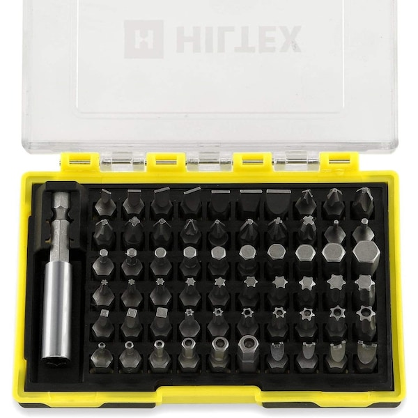 The Hiltex 10060 Bit Set includes the following: (6) Phillips: #0, #1, #2, #2, #2, #3 (5) Pozi: #0, #1, #2, #2, #3 (3) Square: S1, S2, S3(4) Spanner: 4mm, 6mm, 8mm, 10mm (7) Slotted: 1/8'', 5/32'', 13/64'', 7/32'', 15/64'', 9/32'', 5/16'' (12)Hex(MM): 1. 5mm, 2mm, 2. 5mm, 3mm, 3. 5mm, 4mm, 4. 5mm, 5mm, 5. 5mm, 6mm, 7mm, 8mm (10)Star: T8, T9, T10, T15, T20, T25, T27, T30, T35, T40 (7) Tamper Proof Star: T10, T15, T20, T25, T27, T30, T35 (6)Tamper Proof Hex (MM): 2mm, 2. 5mm, 3mm, 4mm, 5mm, 6mm (1) 2-1/4'' Magnetic Extension Bit Holder