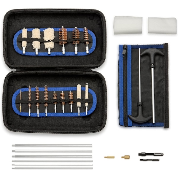 This comprehensive kit was designed to fulfill all your gun cleaning needs. A firearm is a major investment. Properly cleaning & maintaining your firearm will help retain its value as well as performance. Our organized pouch is perfect to throw in your range bag, hang in your gun cabinet or store at your workbench. Kit includes: 3 Solid Aluminum Rods for Rifle/Pistols, 3 Solid Aluminum Rods for Shotguns, 10 Brass Wire Brushes to Fit the Following Guns: 10/12 Gauge, 20/28 Gauge, 410, 45cal, 40cal, 357/38cal, 9mm, 30cal, 270/280cal, 22cal, and 17cal. 5 Mops to Fit: 10/12 Gauge, 20/28 Gauge, 410, 357/38cal, 9mm, and 22cal, 2 Solid Brass Adaptors for Shotgun Mops/Brushes, and Rifle/Pistol Brushes and Mops, 2 Plastic Slotted Tips for Shotguns and Rifles/Pistols, 2 Universal Handles, 75 Cleaning Patches, Packed Conveniently in our Brand New Soft Zippered Compact Storage Case. Flexibility: Interior Component Pieces are Hook and Loop Backed and are Adjustable & Removable.