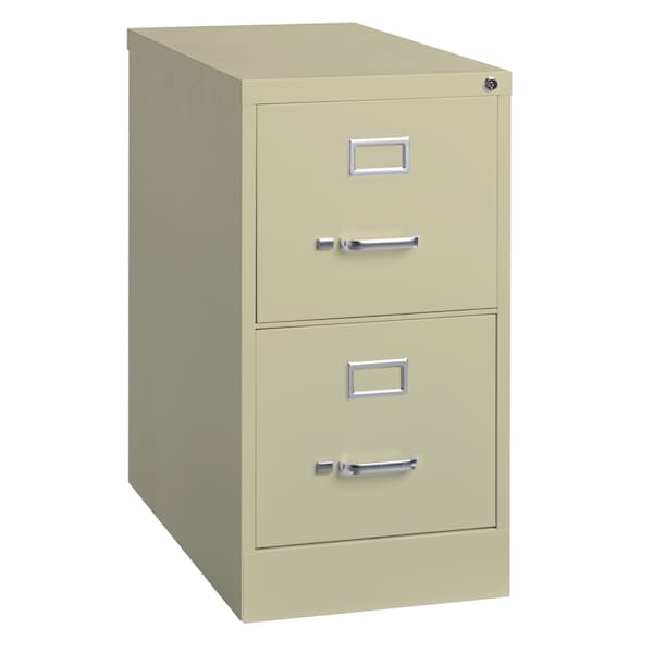 25" deep metal, 2 drawer, letter width, commercial grade vertical file cabinets are perfect for business, educational, or personal offices. These cabinets feature a classic design and are constructed with high quality durable materials that are suitable for heavy-duty use. Ships fully assembled and is ready to accept letter width hanging file folders. Smooth surface is easy to clean. Each drawer includes full extension ball-bearing slides for smooth drawer action. Even fully loaded, these drawers open with ease. Adjustable follower wires keep files upright. The included core-removable lock allows cabinets to be keyed alike. Designed to meet or exceed ANSI-BIFMA industry standards for performance and workmanship. Made with 28% total recycled content. Backed by a Limited Lifetime Warranty.