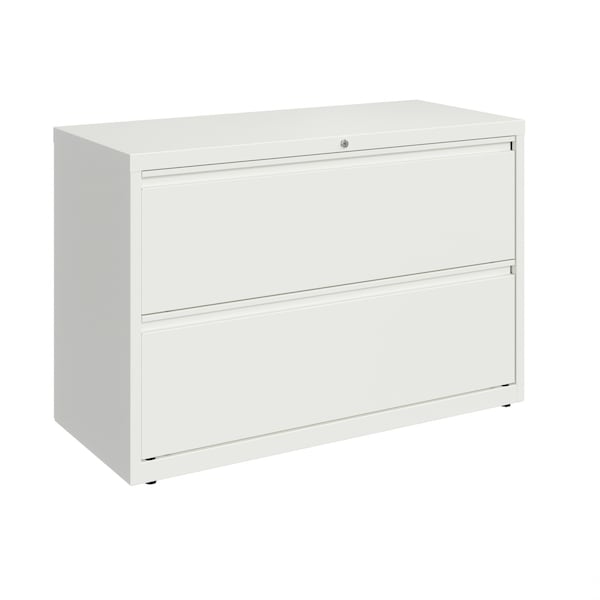 This 42 in. wide 2 drawer commercial grade lateral filing cabinet is designed for heavy duty use, yet looks great in any office. Precision ball-bearing suspension allows for quiet use in your busy office environment. Fully assembled steel construction with reinforced base. Non-porous surface is easy to clean. Interlock system prevents tipping by only allowing one drawer open at a time. Dual lock bars and core-removable lock come standard. Unit includes hang rails, magnetic label holders, and four adjustable leveling glides. Greenguard Gold certified for indoor air quality. Meets or exceeds ANSI-BIFMA standards. TAA compliant. Limited Lifetime Warranty.
