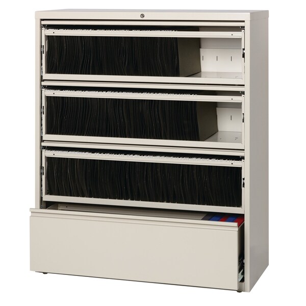 This 42 in. wide 4 drawer commercial grade lateral filing cabinet features three roll-out shelves and one standard drawer. Precision ball-bearing suspension allows for quiet use in your busy office environment. Fully assembled steel construction with reinforced base. Non-porous surface is easy to clean. Interlock system prevents tipping by only allowing one drawer open at a time. Dual lock bars and core-removable lock come standard. Unit includes hang rails, magnetic label holders, and four adjustable leveling glides. Greenguard Gold certified for indoor air quality. Meets or exceeds ANSI-BIFMA standards. TAA compliant. Limited Lifetime Warranty.