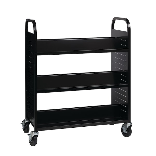Double-sided book cart offers a total of six slanted shelves where you can organize and transport plenty of books and other items. Each shelf measures 36" wide x 7-1/2" deep with 12-1/2" between shelves. The sturdy design features smooth, rounded handles for easy maneuverability and perforated end panels for style and better air circulation. Cart moves easily on 5" casters that all lock for when you need the cart to stay put. Weight capacity is 200 lb. Cart is made of welded steel with a powder-coat finish for long-lasting durability.