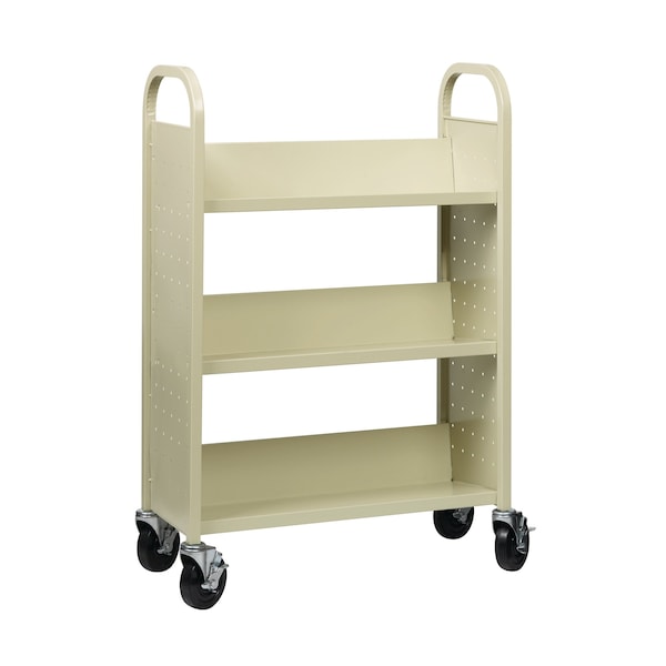 Single-sided book cart offers three slanted shelves where you can organize and transport your books and other items. Each shelf measures 30" wide x 9-1/2" deep with 12-1/2" between shelves. The sturdy design features rounded handles for easy maneuverability and perforated end panels for style and better air circulation. Cart moves easily on 5" casters that all lock for when you need the cart to stay put. Weight capacity is 200 lb. Cart is made of welded steel with a powder-coat finish for long-lasting durability.