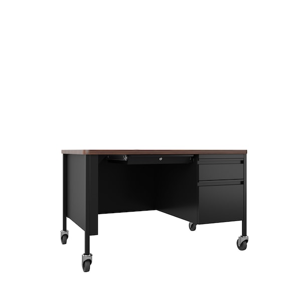 Rectangular Office Desk, Caster/Glide Diameter 3 in, Caster/Glide Type Leveling Glides, Desktop Color Walnut, Desktop Material Melamine, Particleboard, Frame Color Black, Frame Material Steel, Includes Client Surface Yes, Includes Keyboard Tray No, Includes Modesty Panel Yes, Number of Cable Holes 1, Number of Casters/Glides 4, Number of Drawers 3, Number of Pedestals 1, Number of Shelves Not Applicable, Overall Depth 30 in, Overall Height 29 1/2 in, Overall Width 48 in