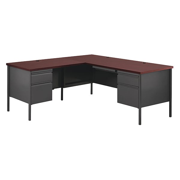 L-Shaped Office Desk, Caster/Glide Diameter Not Applicable, Caster/Glide Type Leveling Glides, Desktop Color Charcoal, Mahogany, Desktop Material Particle Board, Frame Color Charcoal, Mahogany, Frame Material Steel, Includes Client Surface Yes, Includes Keyboard Tray No, Includes Modesty Panel Yes, Number of Cable Holes 3, Number of Casters/Glides 6, Number of Drawers 5, Number of Pedestals 2, Number of Shelves 0, Overall Depth 72 in, Overall Height 29 1/2 in, Overall Width 66 in