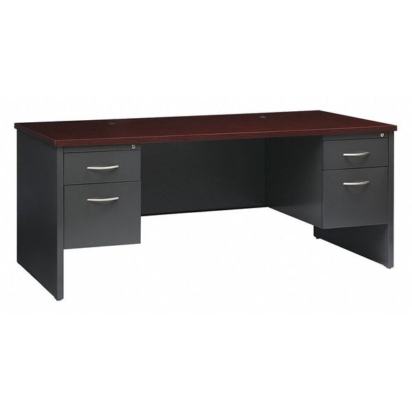 Office Desk, Caster/Glide Diameter Not Applicable, Caster/Glide Type Leveling Glides, Desktop Color Charcoal, Mahogany, Desktop Material Particle Board, Frame Color Charcoal, Mahogany, Frame Material Steel, Includes Client Surface Yes, Includes Keyboard Tray No, Includes Modesty Panel Yes, Number of Cable Holes 2, Number of Casters/Glides 4, Number of Drawers 4, Number of Pedestals 2, Number of Shelves 0, Overall Depth 36 in, Overall Height 29 1/2 in, Overall Width 72 in